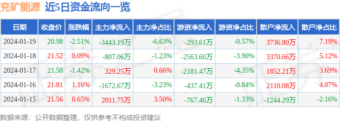 财经消息,截至2024年1月19日收盘,兖矿能源(600188)报收于20.98元,下跌2.51%,换手率0.55%,成交量24.68万手,成交额5.2亿元。