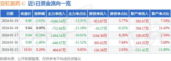 股票行情快报:亚虹医药(688176)1月19日主力资金净卖出1046.54万元
