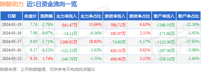 财经消息,截至2024年1月19日收盘,陕鼓动力(601369)报收于7.74元,下跌2.76%,换手率0.46%,成交量7.7万手,成交额6010.77万元。