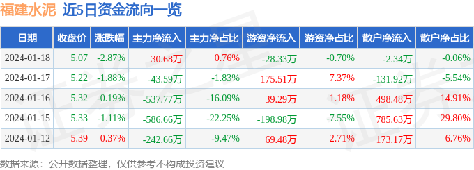福建水泥(600802)1月18日主力资金净买入30.68万元