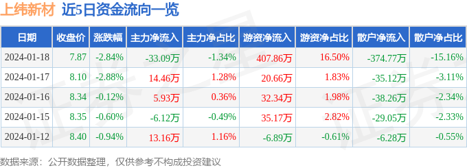 上纬新材(688585)1月18日主力资金净卖出33.09万元