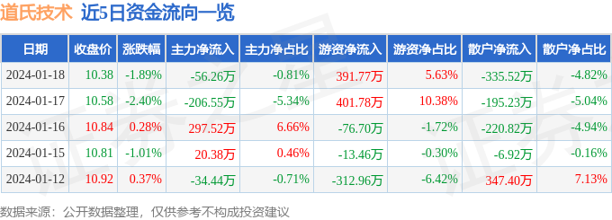 股票行情快报:道氏技术(300409)1月18日主力资金净卖出56.26万元