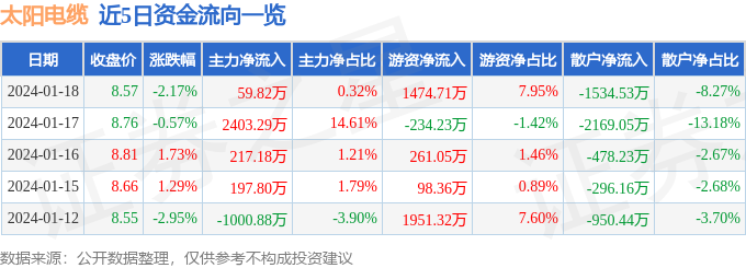 财经消息,截至2024年1月18日收盘,太阳电缆(002300)报收于8.57元,下跌2.17%,换手率3.0%,成交量21.68万手,成交额1.85亿元。