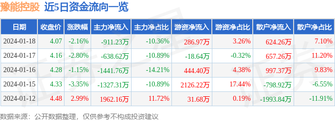 财经消息,截至2024年1月18日收盘,豫能控股(001896)报收于4.07元,下跌2.16%,换手率1.65%,成交量21.82万手,成交额8795.44万元。