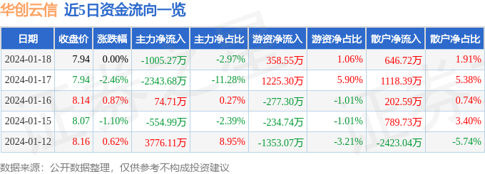 财经消息,截至2024年1月18日收盘,华创云信(600155)报收于7.94元,上涨0.0%,换手率1.91%,成交量43.15万手,成交额3.38亿元。