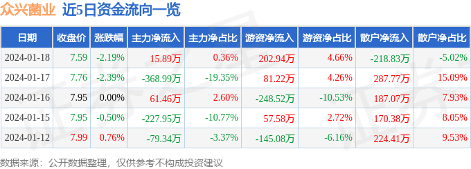 财经消息,截至2024年1月18日收盘,众兴菌业(002772)报收于7.59元,下跌2.19%,换手率1.49%,成交量5.81万手,成交额4358.31万元。
