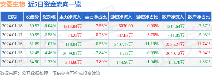 股票行情快报:安图生物(603658)1月18日主力资金净买入1214.04万元