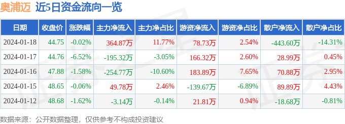 股票行情快报:奥浦迈(688293)1月18日主力资金净买入364.87万元