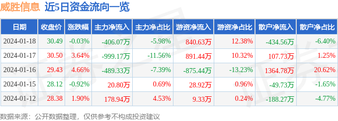 1月18日的资金流向数据方面,主力资金净流出406.07万元,占总成交额5.98%,游资资金净流入840.63万元,占总成交额12.38%,散户资金净流出434.56万元,占总成交额6.4%。