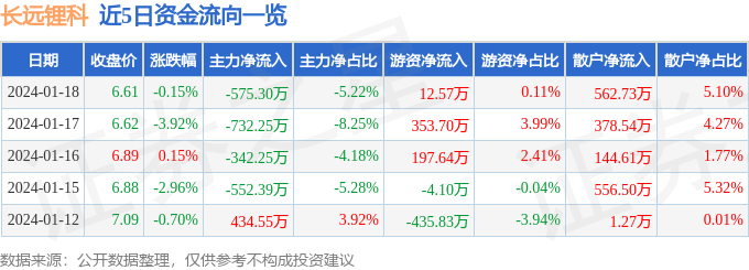 股票行情快报:长远锂科(688779)1月18日主力资金净卖出575.30万元