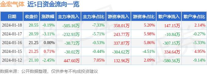 股票行情快报:金宏气体(688106)1月18日主力资金净卖出505.16万元