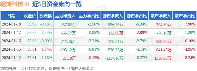 1月18日的资金流向数据方面,主力资金净流出257.62万元,占总成交额2.56%,游资资金净流出536.77万元,占总成交额5.34%,散户资金净流入794.39万元,占总成交额7.9%。