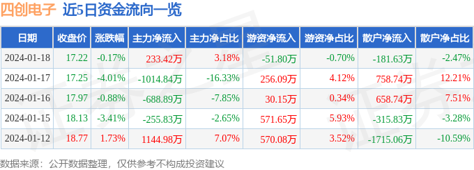 1月18日的资金流向数据方面,主力资金净流入233.42万元,占总成交额3.18%,游资资金净流出51.8万元,占总成交额0.7%,散户资金净流出181.63万元,占总成交额2.47%。
