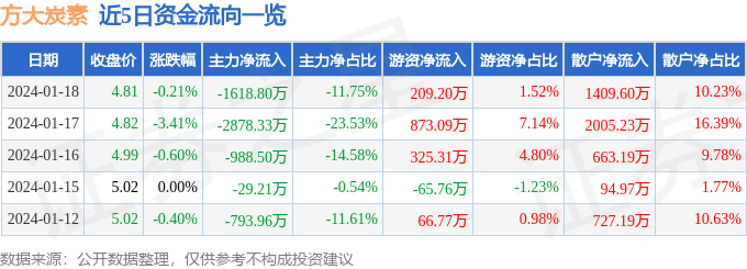 财经消息,截至2024年1月18日收盘,方大炭素(600516)报收于4.81元,下跌0.21%,换手率0.72%,成交量29.15万手,成交额1.38亿元。