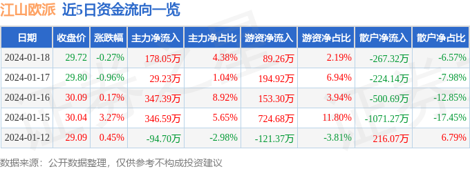 1月18日的资金流向数据方面,主力资金净流入178.05万元,占总成交额4.38%,游资资金净流入89.26万元,占总成交额2.19%,散户资金净流出267.32万元,占总成交额6.57%。