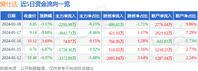爱仕达(002403)1月18日主力资金净卖出2295.99万元