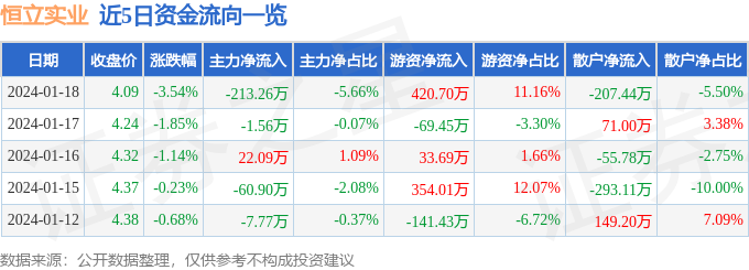财经消息,截至2024年1月18日收盘,恒立实业(000622)报收于4.09元,下跌3.54%,换手率2.16%,成交量9.17万手,成交额3768.48万元。
