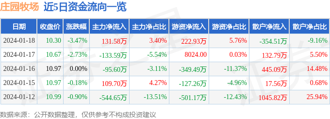 庄园牧场(002910)1月18日主力资金净买入131.58万元