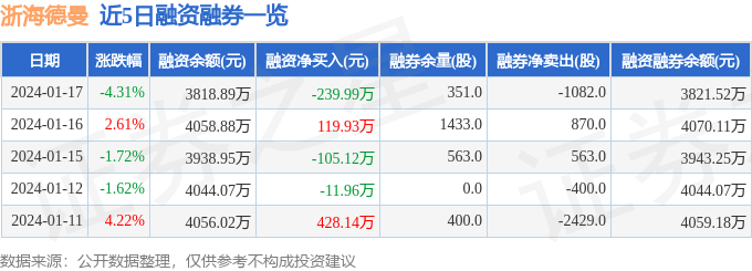 浙海德曼融资融券信息显示,融资方面,当日融资买入91.07万元,融资偿还331.07万元,融资净偿还239.99万元。融券方面,融券卖出0.0股,融券偿还1082.0股,融券余量351.0股,融券余额2.63万元。融资融券余额3821.52万元。近5日融资融券数据一览见下表: