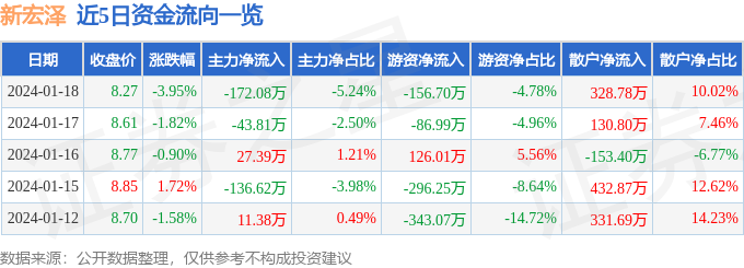 新宏泽(002836)1月18日主力资金净卖出172.08万元