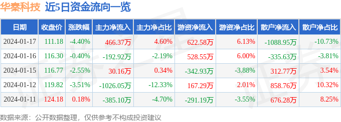 华秦科技(688281)1月17日主力资金净买入466.37万元