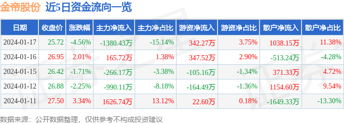 金帝股份(603270)1月17日主力资金净卖出1380.43万元