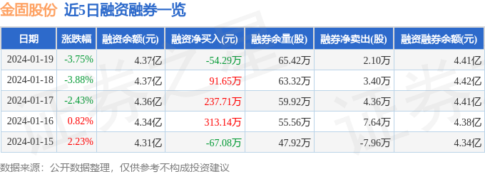 金固股份融资融券信息显示,融资方面,当日融资买入552.5万元,融资偿还606.79万元,融资净偿还54.29万元。融券方面,融券卖出5.55万股,融券偿还3.45万股,融券余量65.42万股,融券余额437.02万元。融资融券余额4.41亿元。近5日融资融券数据一览见下表: