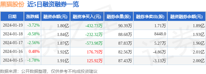 黑猫股份融资融券信息显示,融资方面,当日融资买入642.28万元,融资偿还1075.01万元,融资净偿还432.73万元。融券方面,融券卖出11.0万股,融券偿还9.29万股,融券余量90.39万股,融券余额888.5万元。融资融券余额1.89亿元。近5日融资融券数据一览见下表: