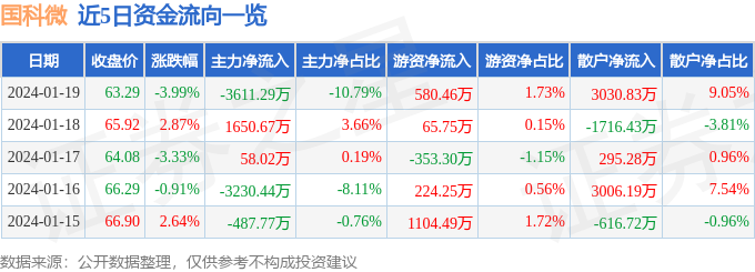 财经消息,截至2024年1月19日收盘,国科微(300672)报收于63.29元,下跌3.99%,换手率2.47%,成交量5.19万手,成交额3.35亿元。