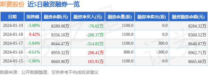 斯菱股份融资融券信息显示,融资方面,当日融资买入169.45万元,融资偿还245.48万元,融资净偿还76.02万元。融券方面,融券卖出1100.0股,融券偿还1100.0股,融券余量1100.0股,融券余额4.25万元。融资融券余额8284.32万元。近5日融资融券数据一览见下表: