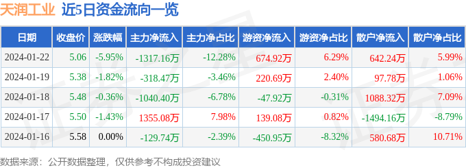 财经消息,截至2024年1月22日收盘,天润工业(002283)报收于5.06元,下跌5.95%,换手率2.05%,成交量20.63万手,成交额1.07亿元。