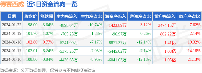 股票行情快报:德赛西威(002920)1月22日主力资金净卖出4898.04万元