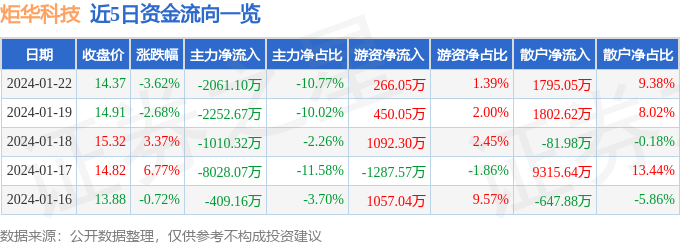 财经消息,截至2024年1月22日收盘,炬华科技(300360)报收于14.37元,下跌3.62%,换手率2.66%,成交量13.18万手,成交额1.91亿元。