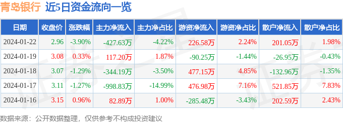 股票行情快报:青岛银行(002948)1月22日主力资金净卖出427.63万元