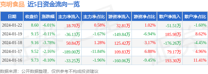 股票行情快报:克明食品(002661)1月22日主力资金净买入18.70万元