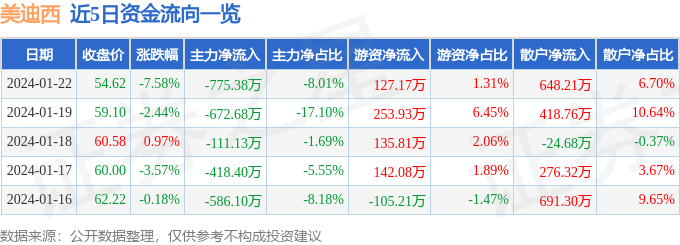 财经消息,截至2024年1月22日收盘,美迪西(688202)报收于54.62元,下跌7.58%,换手率1.57%,成交量1.72万手,成交额9675.21万元。