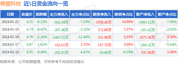 财经消息,截至2024年1月22日收盘,佛塑科技(000973)报收于4.35元,下跌8.23%,换手率3.0%,成交量28.99万手,成交额1.31亿元。