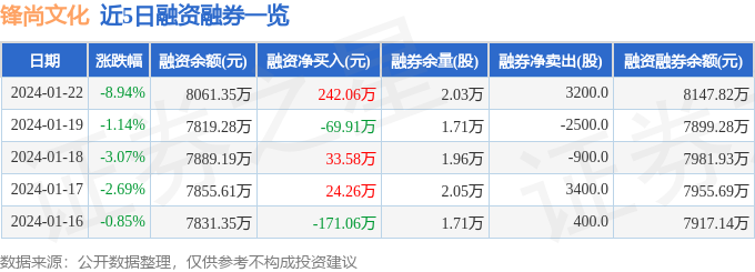 锋尚文化融资融券信息显示,融资方面,当日融资买入701.62万元,融资偿还459.55万元,融资净买入242.06万元。融券方面,融券卖出3900.0股,融券偿还700.0股,融券余量2.03万股,融券余额86.48万元。融资融券余额8147.82万元。近5日融资融券数据一览见下表: