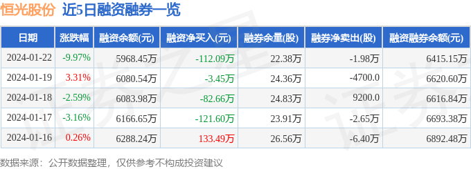 恒光股份融资融券信息显示,融资方面,当日融资买入354.44万元,融资偿还466.53万元,融资净偿还112.09万元。融券方面,融券卖出1.65万股,融券偿还3.63万股,融券余量22.38万股,融券余额446.7万元。融资融券余额6415.15万元。近5日融资融券数据一览见下表: