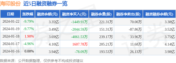 海印股份融资融券信息显示,融资方面,当日融资买入1519.68万元,融资偿还2969.59万元,融资净偿还1449.91万元。融券方面,融券卖出71.53万股,融券偿还1.53万股,融券余量221.31万股,融券余额387.29万元。融资融券余额3.38亿元。近5日融资融券数据一览见下表: