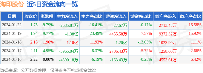 财经消息,截至2024年1月22日收盘,海印股份(000861)报收于1.75元,下跌9.79%,已连续跌停2天,换手率3.89%,成交量92.88万手,成交额1.64亿元。