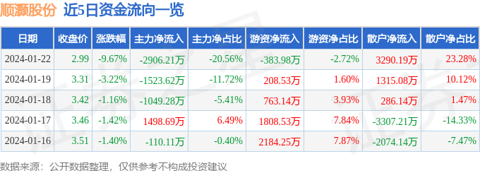 顺灏股份(002565)1月22日主力资金净卖出2906.21万元