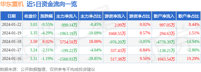 财经消息,截至2024年1月22日收盘,华东重机(002685)报收于3.03元,下跌9.55%,换手率4.57%,成交量37.16万手,成交额1.18亿元。