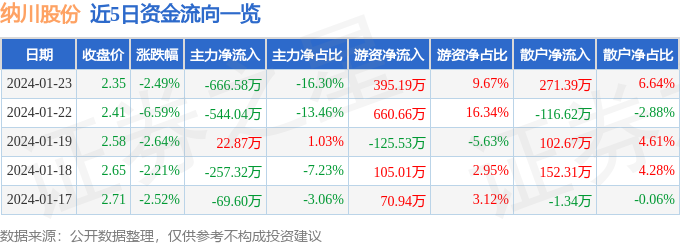 纳川股份(300198)1月23日主力资金净卖出666.58万元
