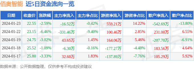 佰奥智能(300836)1月23日主力资金净卖出16.52万元