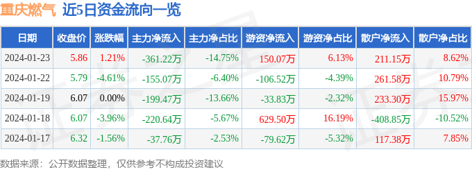 股票行情快报:重庆燃气(600917)1月23日主力资金净卖出361.22万元