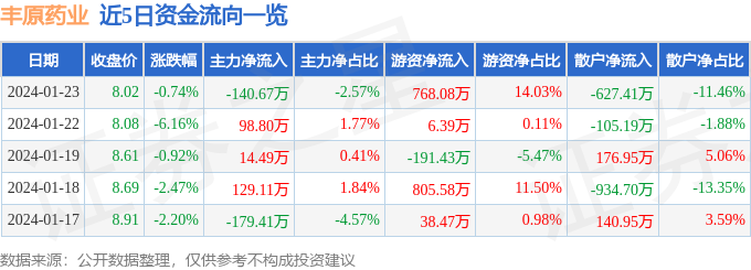 财经消息,截至2024年1月23日收盘,丰原药业(000153)报收于8.02元,下跌0.74%,换手率2.16%,成交量6.88万手,成交额5474.8万元。