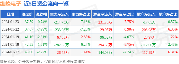 股票行情快报:维峰电子(301328)1月23日主力资金净卖出214.73万元