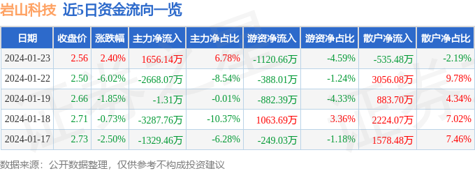 财经消息,截至2024年1月23日收盘,岩山科技(002195)报收于2.56元,上涨2.4%,换手率1.71%,成交量96.68万手,成交额2.44亿元。