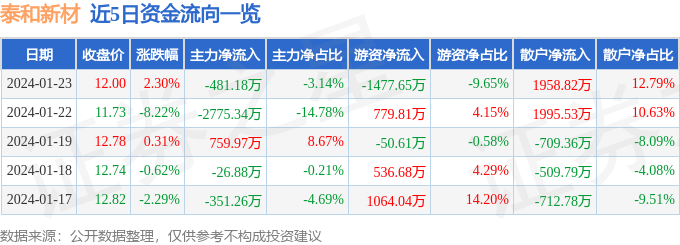 股票行情快报:泰和新材(002254)1月23日主力资金净卖出481.18万元